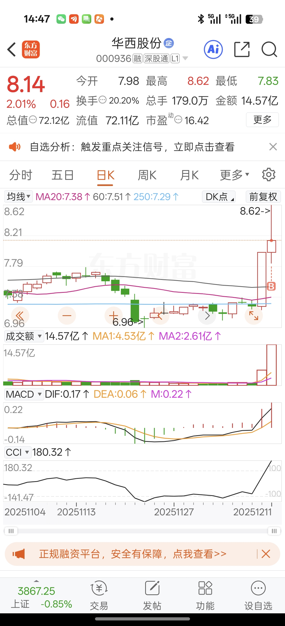 $华西股份(SZ000936)$ 两个点追也会被套,今天还有其他高点追的吗韭菜,还好买了两千块,不然亏大了