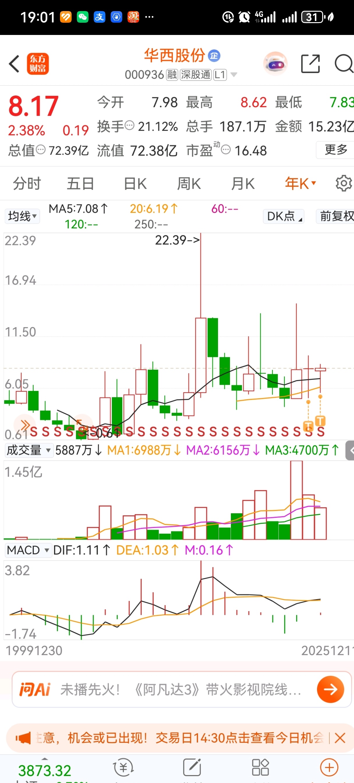 华西股份要用中长线眼光看,格局点,七年来收盘价阳线最高,主力已解放了这么多人,不会只为一倍涨幅,月线指标也要求至少还有很大空间,问题在能持有到最后还能有几个人
