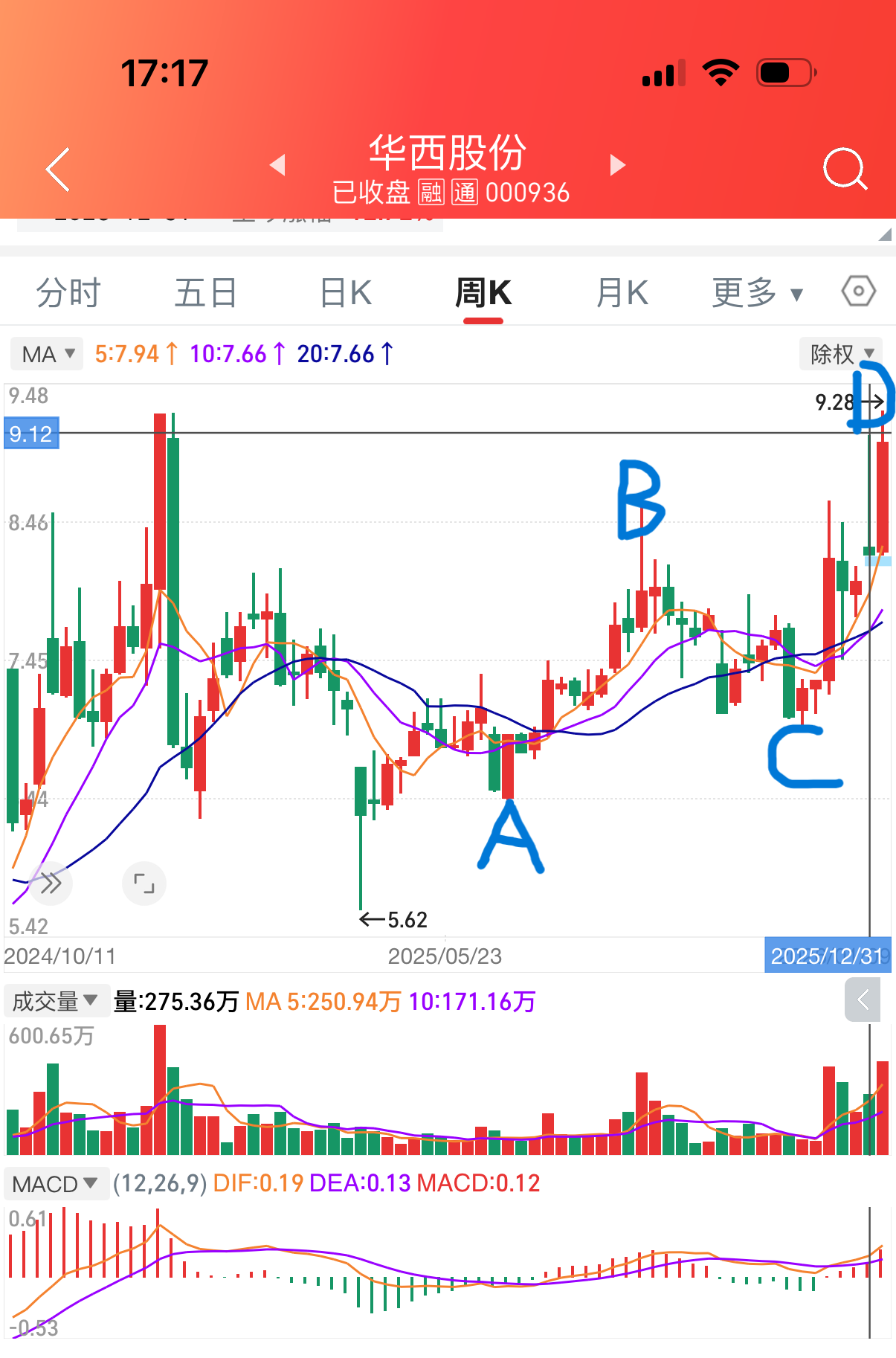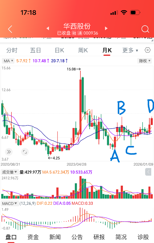 华西周线和月线波浪对称与倍数对称研判后市向上运行周期:1、从周线看A到B运行11