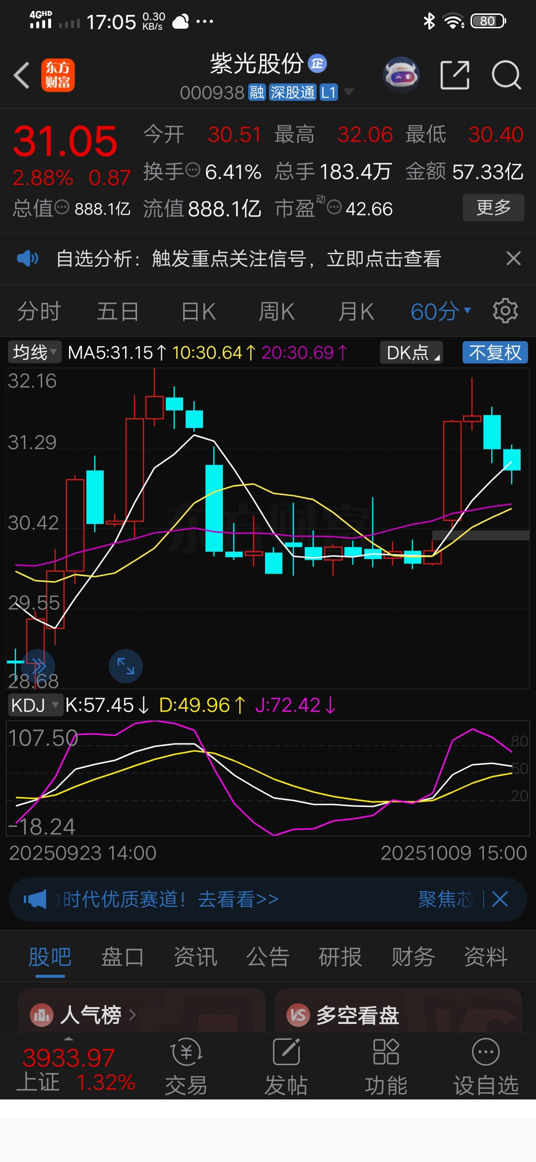 $紫光股份(SZ000938)$ 对比上一次摸32后的走势,看60分钟K线,明天就是大阴线!