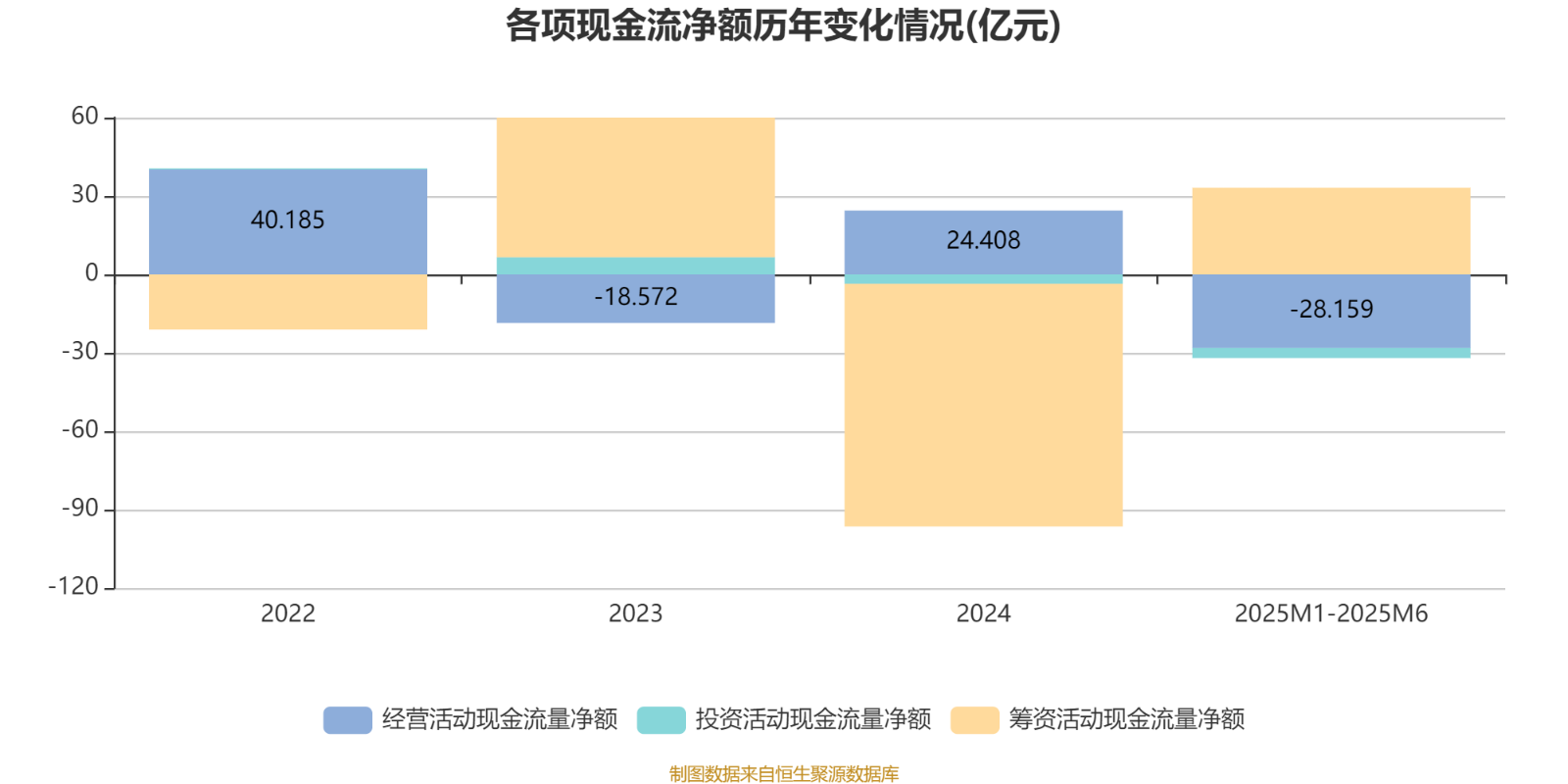 2025年1月至6月,公司经营活动现金流净额为-28.16亿元,同比增加4.03亿元;筹资活动现金流净额33.15亿元,同比增加14.94亿元;投资活动现金流净额-3.83亿元,上年同期为-1.24亿元。