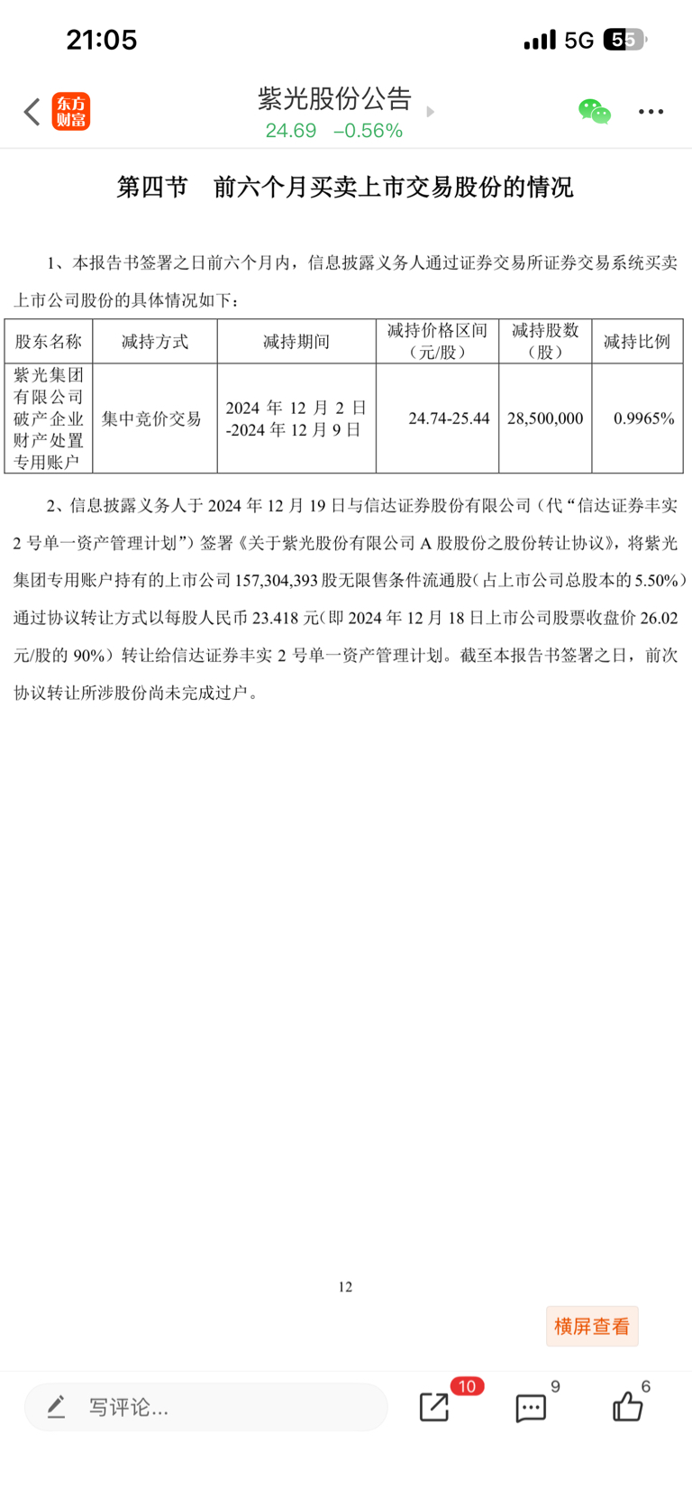 $紫光股份(SZ000938)$ 两家接盘的股东年底前都在减持,当初接手时一个是23.418元/股,一个是24.363元/股,持有时间都是一年左右时间。现在减持没有什么差价。高点的时候30元左右不减持,现在减持。最主要的还是要看业绩。你看易中天,越减持反而越涨。紫光去年12月份也是减持。股价还在25元左右减持的。现在减持估计还是在24元左右减持。