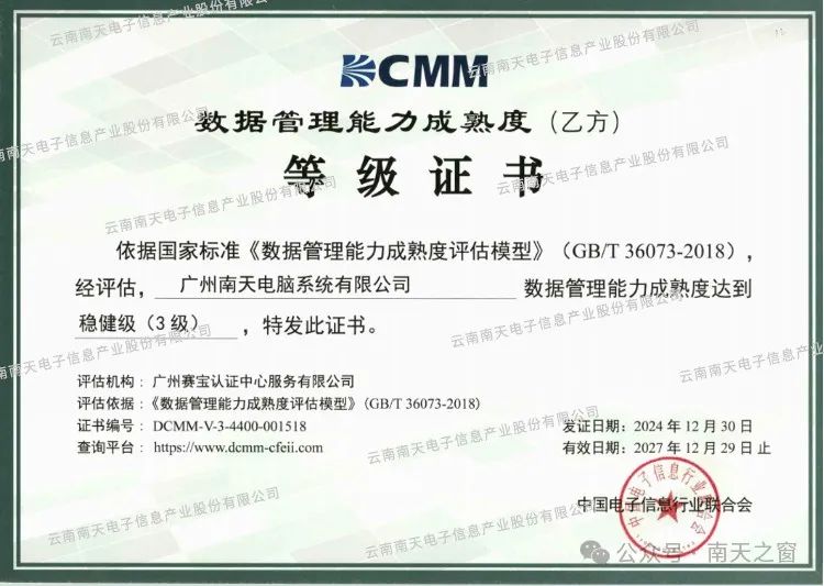 近日,经中国电子信息行业联合会评估认证,南天信息全资子公司广州南天电脑系统有限公司成功通过数据管理能力成熟度稳健级(3级)认证,标志着公司数据管理能力达到行业先进水平,数字化水平建设再上新台阶。