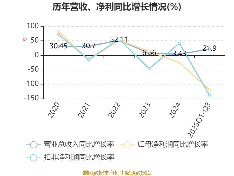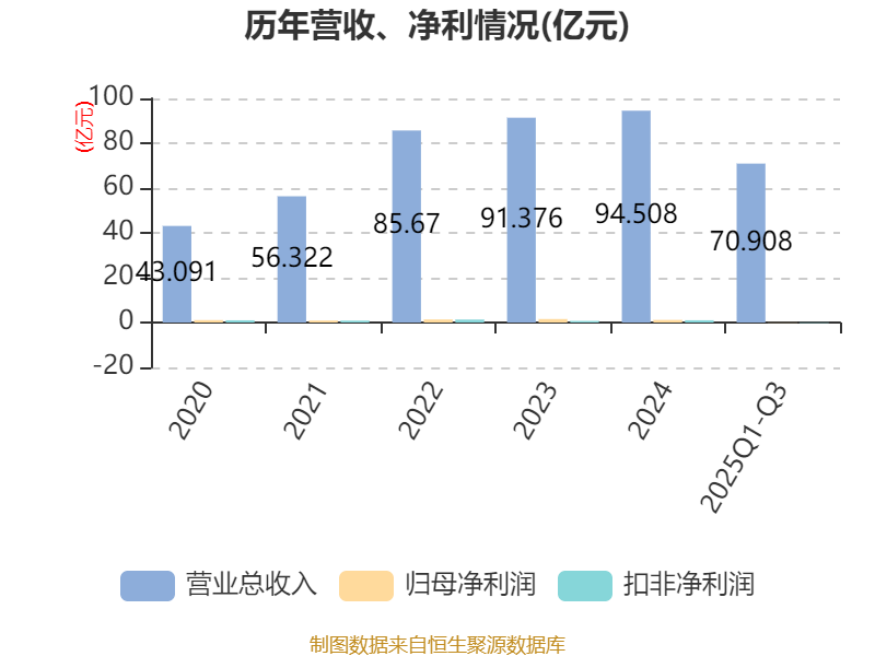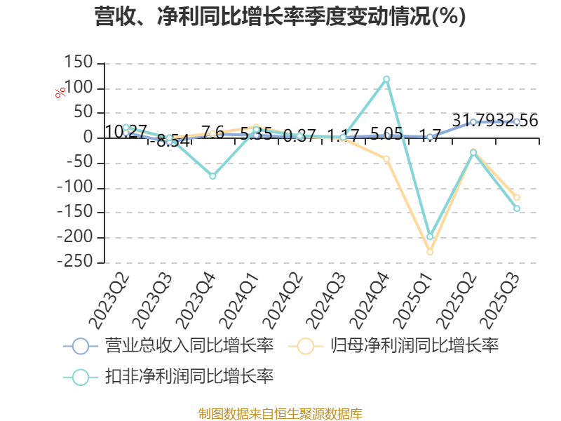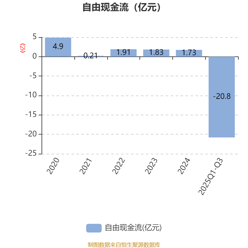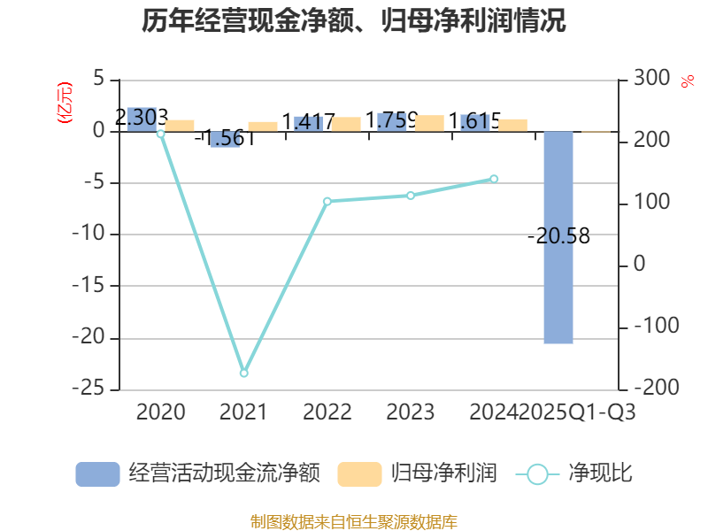 2025年前三季度,公司经营活动现金流净额为-20.58亿元,同比减少4.82亿元;筹资活动现金流净额5.03亿元,同比增加1.25亿元;投资活动现金流净额-2175.99万元,上年同期为4505.74万元。
