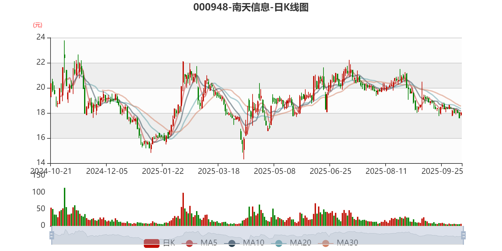 中证智能财讯南天信息(000948)10月21日披露2025年第三季度报告。前三季度公司实现营业总收入70.91亿元,同比增长21.90%;归母净利润亏损1089.98万元,上年同期盈利5592.74万元;扣非净利润亏损2064.36万元,上年同期盈利5368.75万元;经营活动产生的现金流量净额为-20.58亿元,上年同期为-15.76亿元;报告期内,南天信息基本每股收益为-0.0277元,加权平均净资产收益率为-0.40%。
