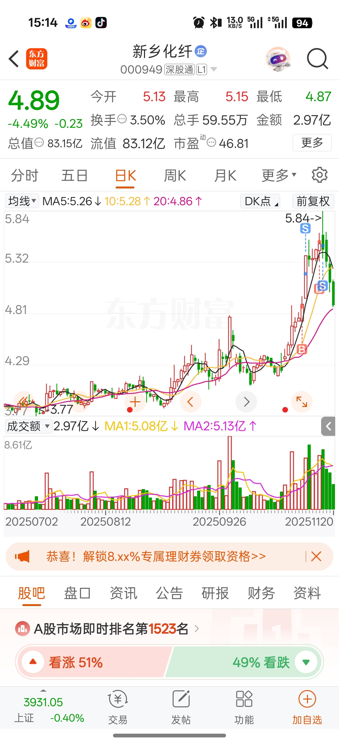 $新乡化纤(SZ000949)$ 拉高回落果断割肉,回头一看还好割得快