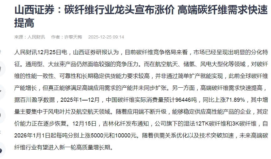 $新乡化纤(SZ000949)$ 山西证券:碳纤维行业龙头宣布涨价 高端碳纤维需求快速提高 ,在航空航天、储氢、风电大型化等领域,对碳纤维的性能一致性、可靠性和长期稳定供货能力要求较高,并非通过简单扩产就能实现,此前全球碳纤维产能增长,但真正能够满足高端应用需求的产能并未同步扩张。