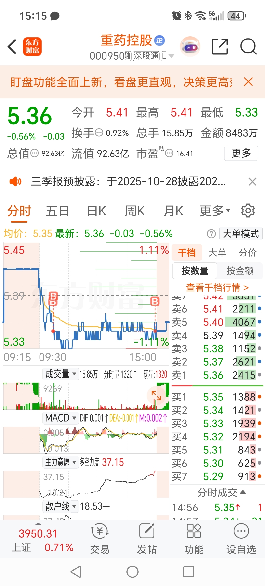 $重药控股(SZ000950)$ 5.35低吸2口,今天数票子937元给庄家