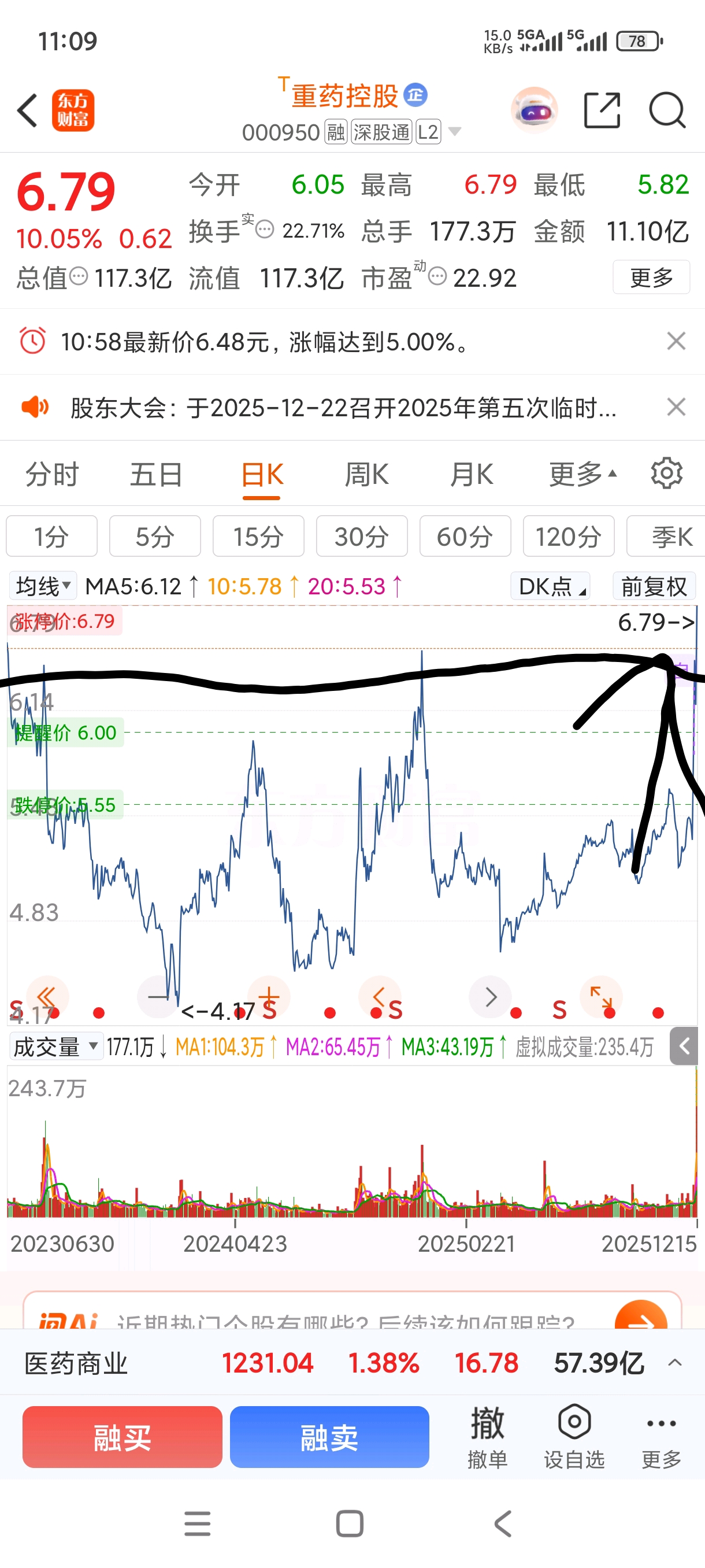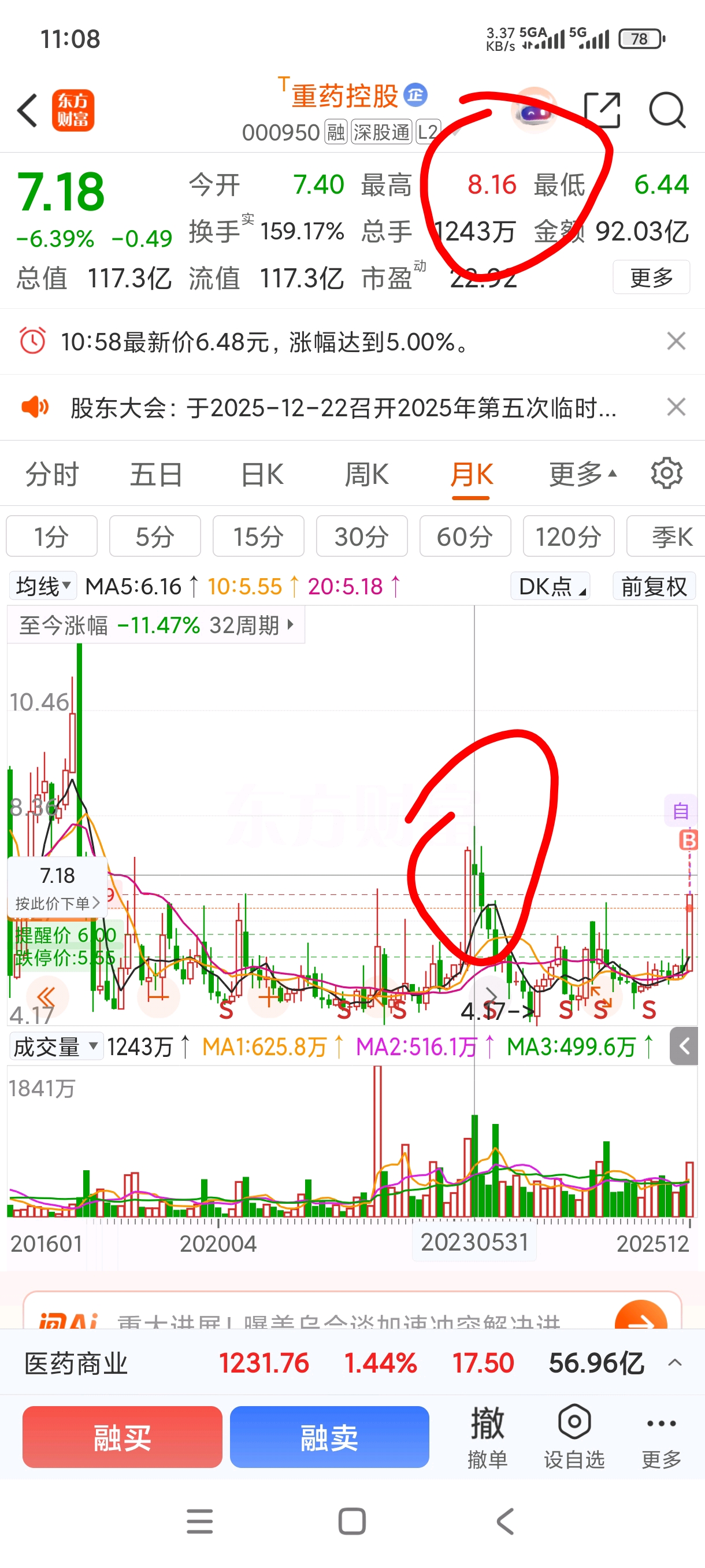 $重药控股(SZ000950)$ 长期横盘,无人问津,利好突袭,前两板未放量,三板巨量换手,种种条件,格局一下,不卖了,如若今天封板,拿到8.16再说,兄弟们我决定了,不去外面追高航天了,航天分歧太多,选不准,就在这看主力表演了,希望给12月更多惊喜