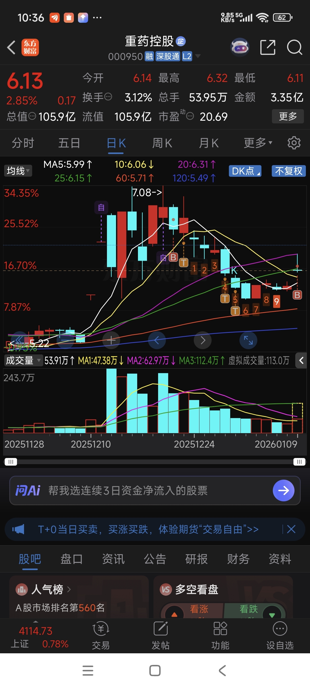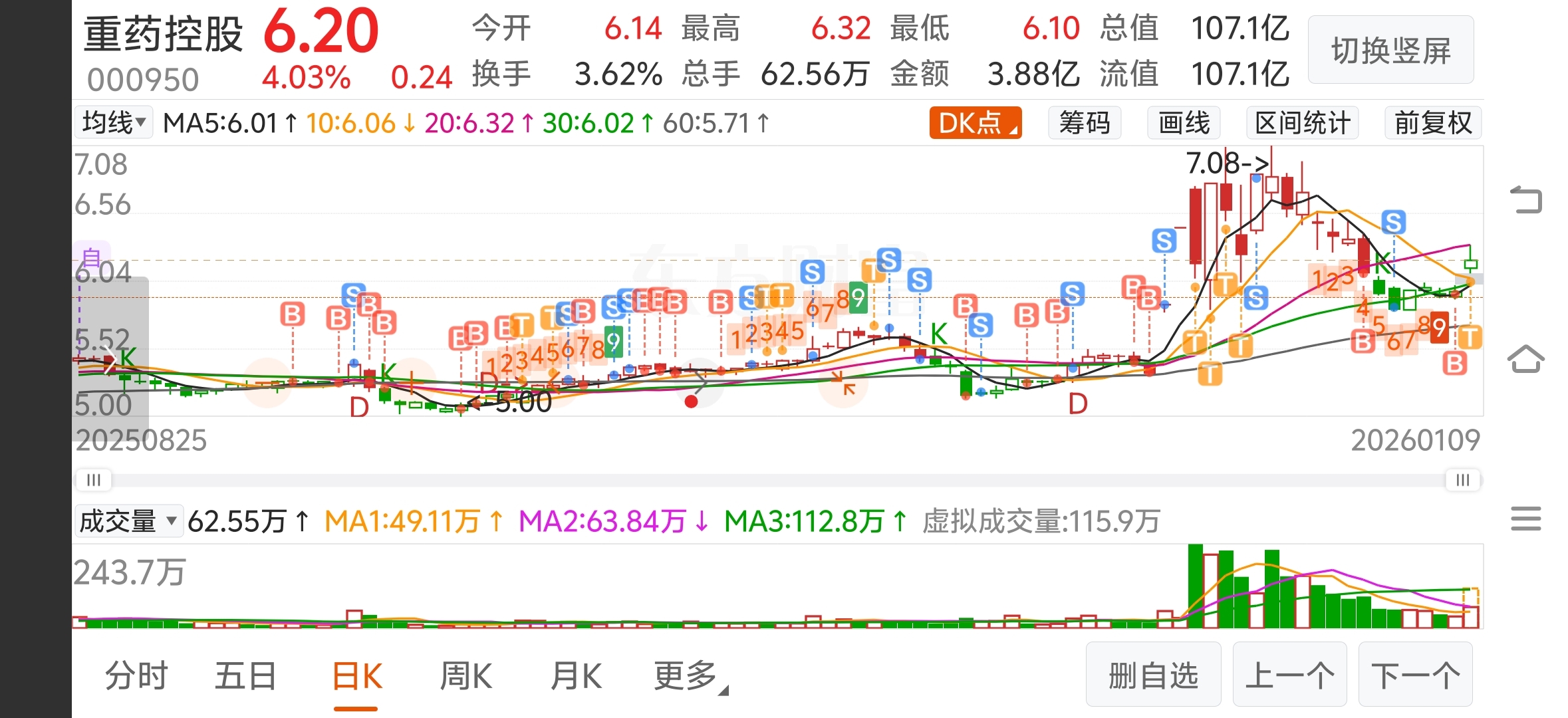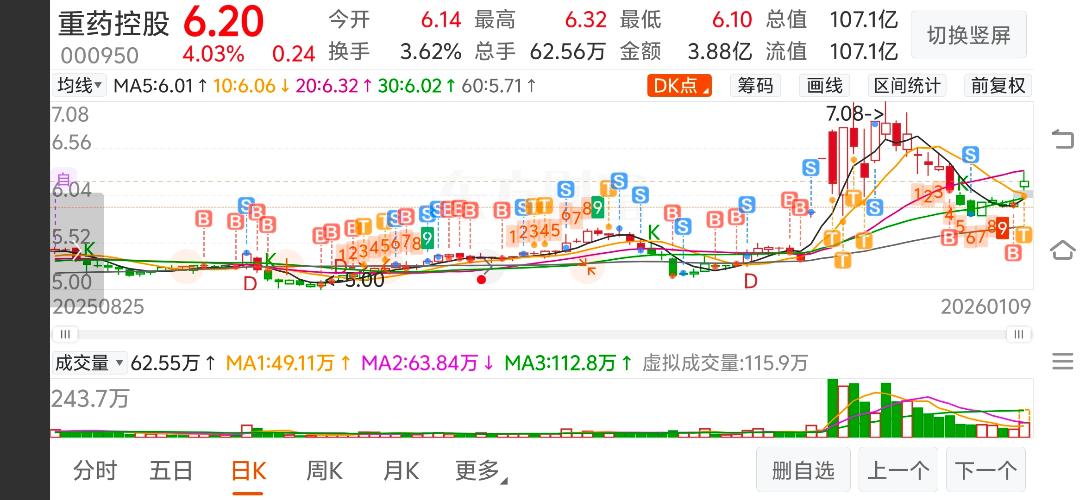 $重药控股(SZ000950)$ 做短线的千万不要买这个股!我是做短线赚了钱卖了的当天又买回来,第二天直接低开把头天的利润都没了还套起!现在被动持股!再连续两次先买后面做t都失败!今天高开嘛,指数也走得好,我就又6.18元买入,想做t降低成本!码德个巴子,现在走成这个熊样!