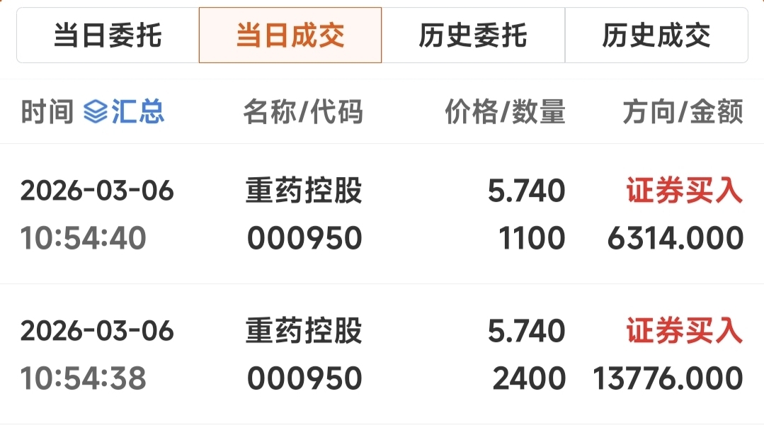 $重药控股(SZ000950)$ 低卖高买。买进去太不易了。刚成交。