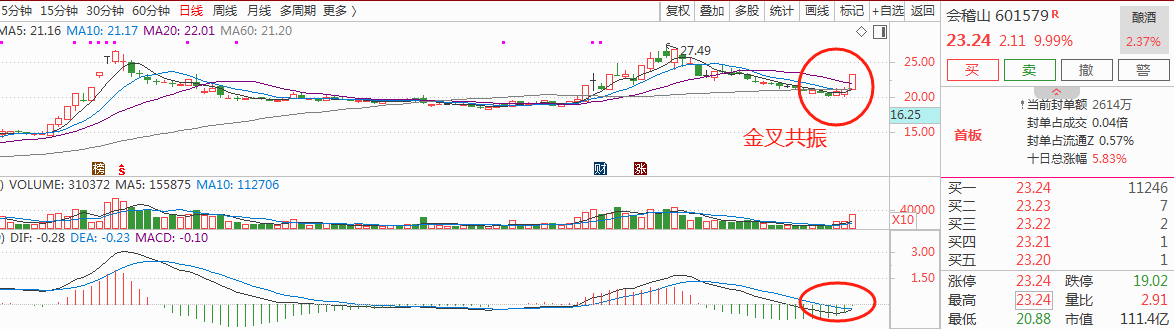 这个是白酒概念,其实更是新零售跟大消费方向。会稽山公司主要从事黄酒的生产、销售和研发。是全国运营历史最悠久的黄酒企业之一,位居黄酒行业前三位,G20杭州峰会、杭州亚运会指定用酒,产品已出口多个国家和地区;公司注重市场拓展,尤其在江浙沪等传统黄酒消费区域,积极拓展全国市场,并远销海外。通过多渠道的销售网络,公司不断提升产品价值和企业价值,致力于黄酒行业的发展和黄酒文化的传播。昨天市场板块轮动到了白酒板块,其实也大消费促发,盘后利好,在经济形势专家和企业家座谈会上,提出要持续用力扩大内需、做强国内大循环,不断形成扩内需的新增长点,降息之后也是利多大消费这个方向。昨天酿酒板块仅有会稽山一只涨停,新零售板块则有两只涨停,还有一只是国光连锁,其实二板的国光比会稽山更具辨识度,但偏偏是烂板,而会稽山的首板也让第三波主升浪的形态初见雏形,均线系统跟MACD指标成金叉共振也是一大看点,今天不收断头铡刀阴线应该不影响三浪的形成。