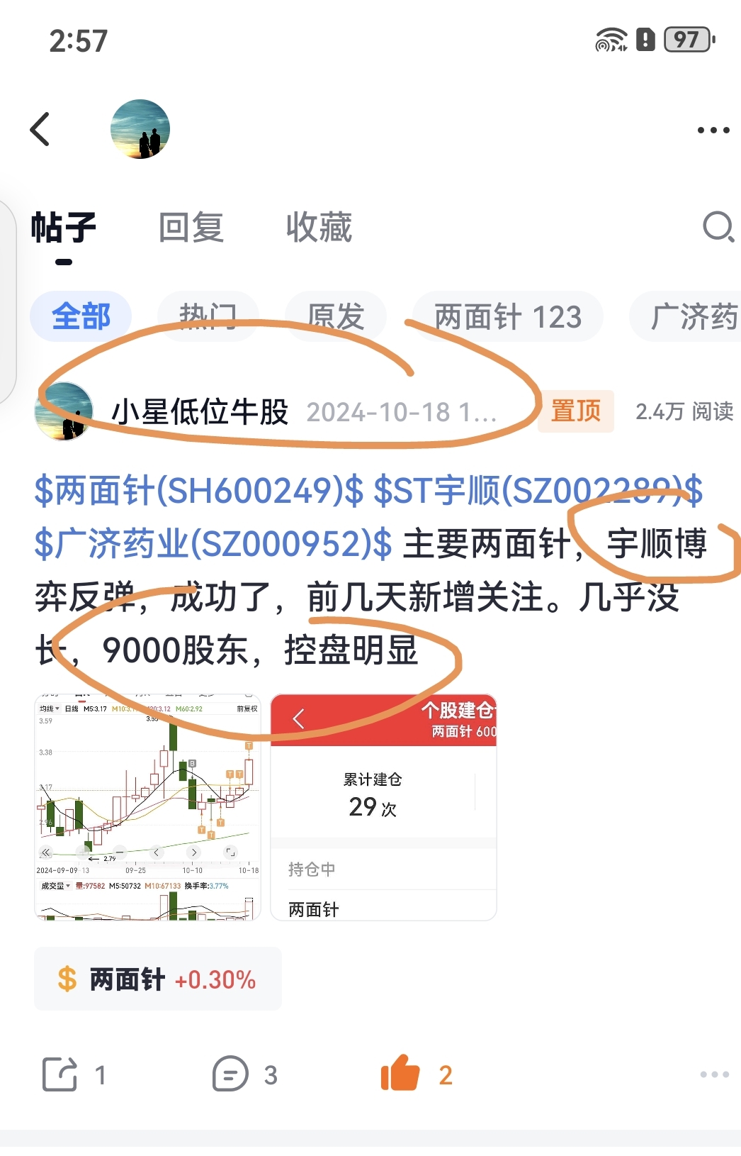 $广济药业(SZ000952)$ $两面针(SH600249)$ $*ST宇顺(SZ002289)$ 我在某球也发文,置顶一年的帖子是这个。呵呵。3块多发掘宇顺,当时喷购说,小星的也说又要退市了,哈哈