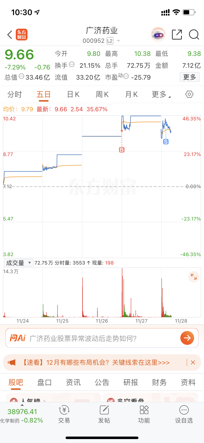 $广济药业(SZ000952)$ 第一次打板就吃大面,感谢主力让我出来