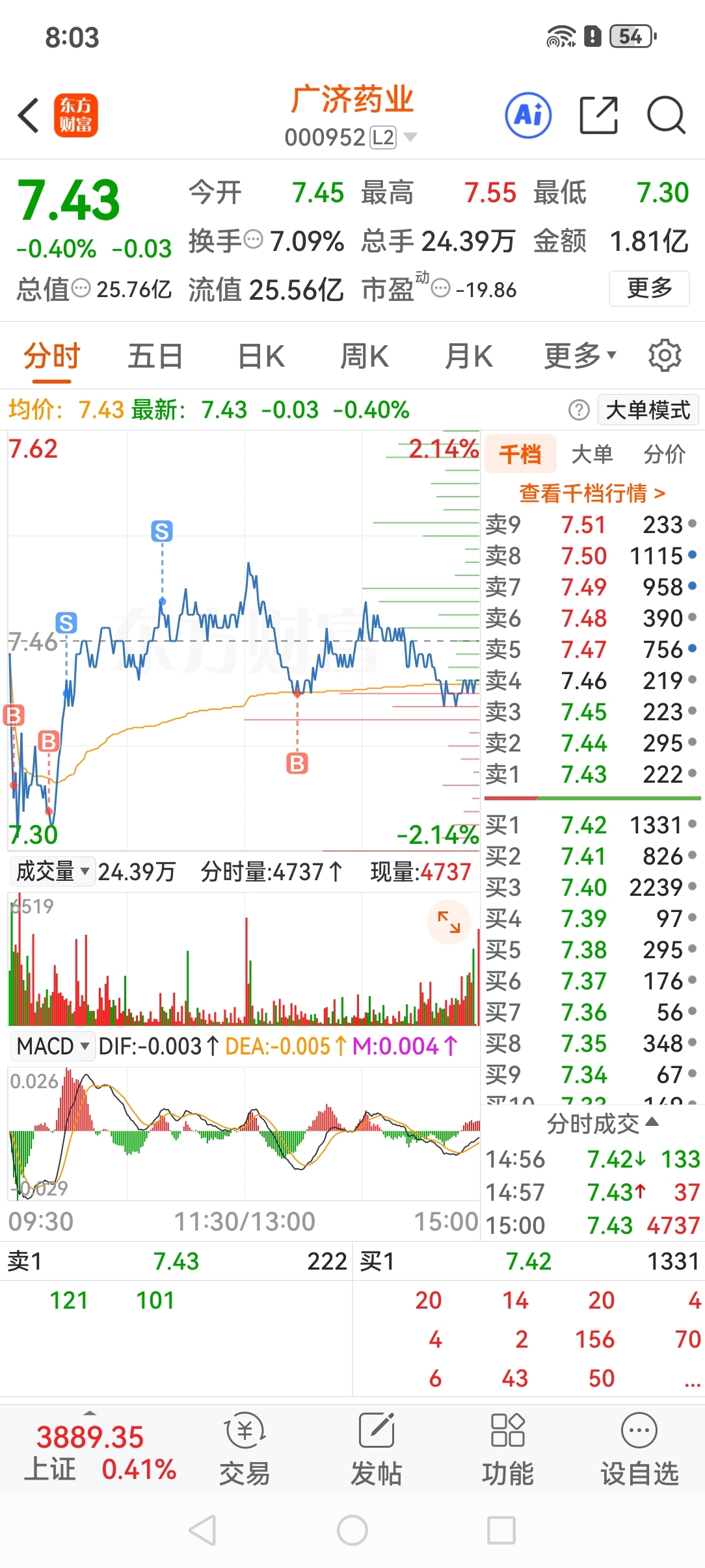 $广济药业(SZ000952)$ $两面针(SH600249)$ 珍珍为主60%,成本两块以下,持股1500多天,广济15%,之前赚了两波(见同步发帖),这次买入成本7.6,今天差价后成本7.55元,万东本来长期拿,考虑仓位,赚了1%出了,留了一点点种子。