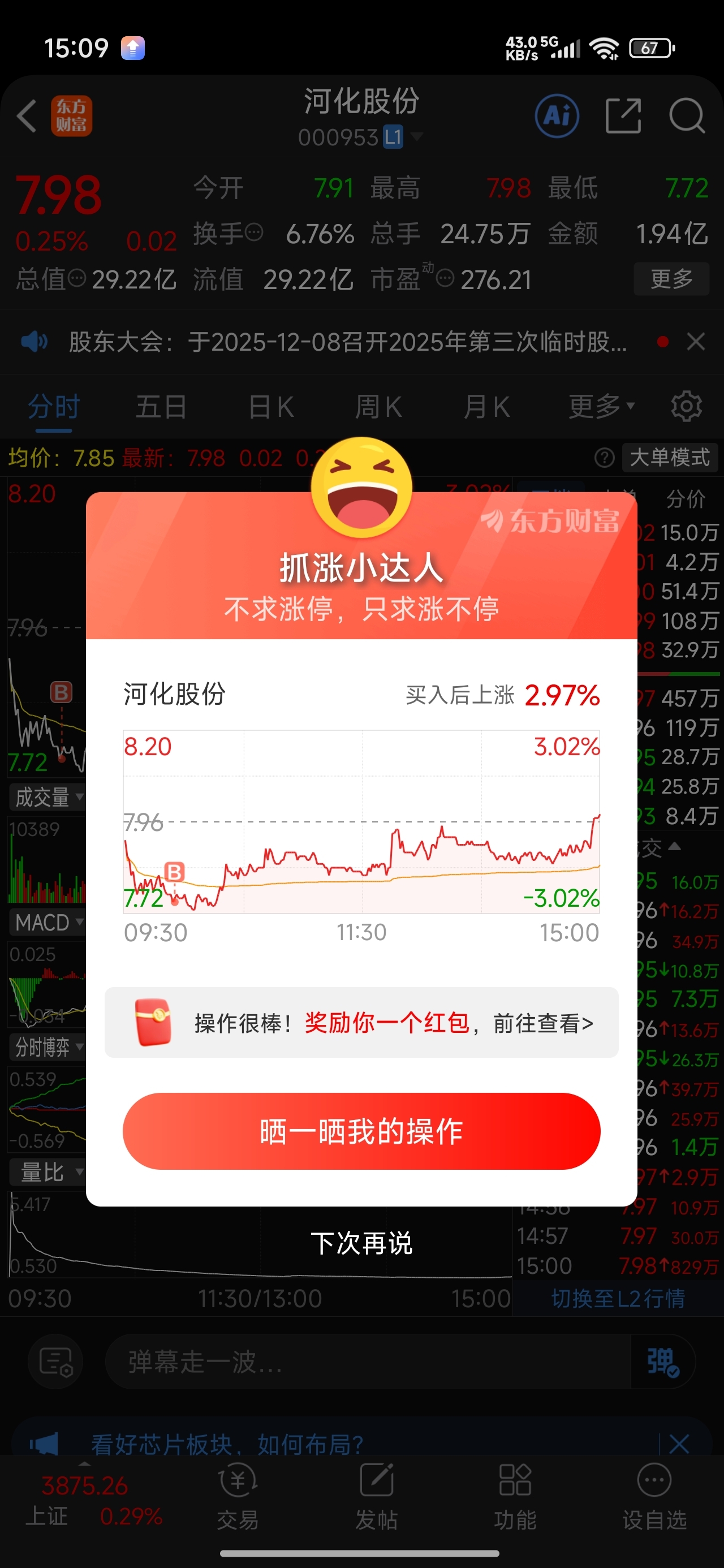 $河化股份(SZ000953)$ 明天若低开低走,保兑现1.5%,可以?