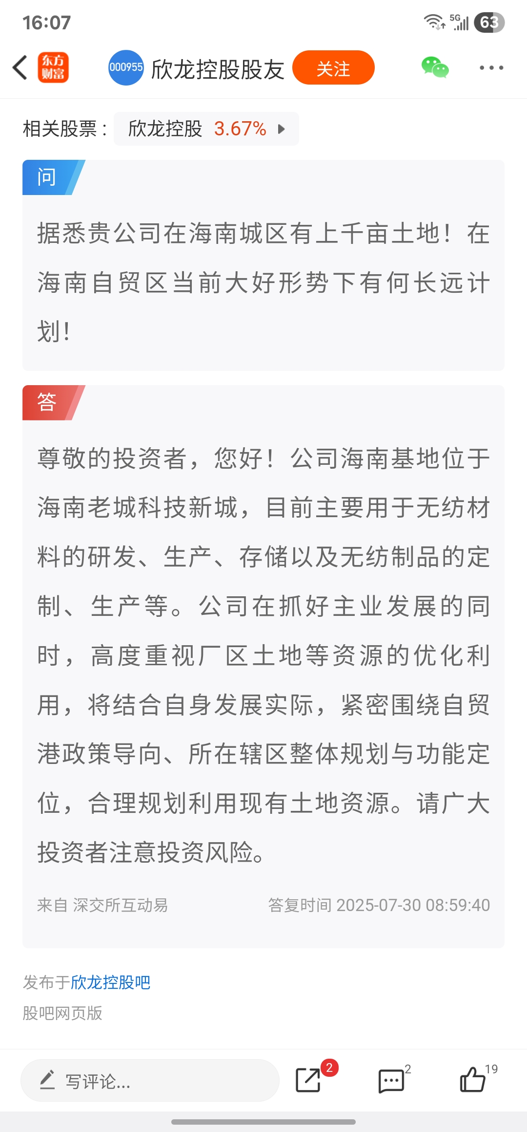 $欣龙控股(SZ000955)$ 十大股东5家杭州的,估计是海南封关龙头股,新闻报道生产产品内销免关税,而且公司有上千亩地