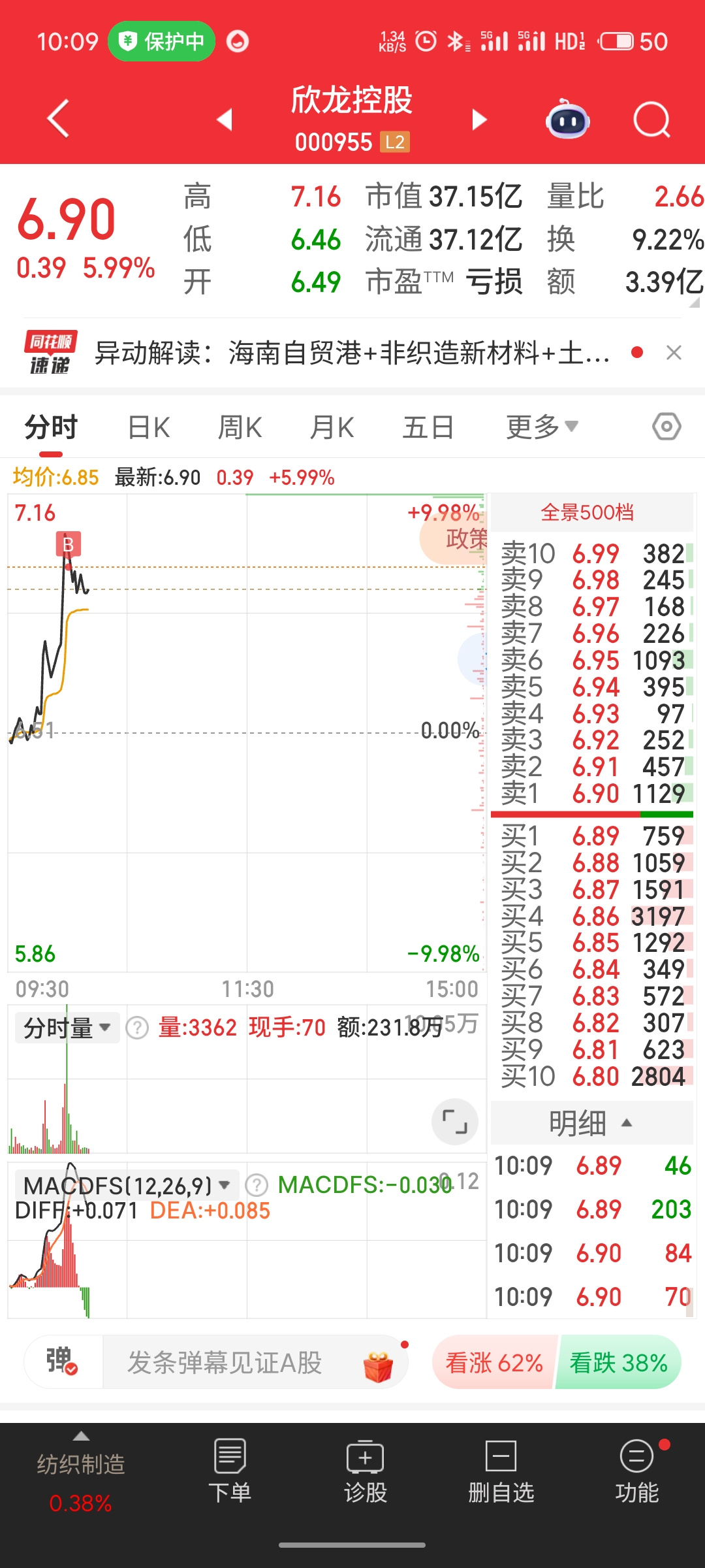 $欣龙控股(SZ000955)$ 森马太慢了,梭哈欣龙看看,止损6.2