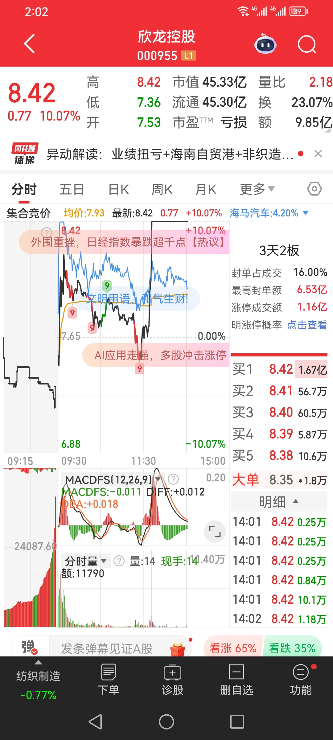 方军今天操盘股票服装,九牧王一字板,早盘低买股票,下午开盘低买股票。七匹狼,欣龙