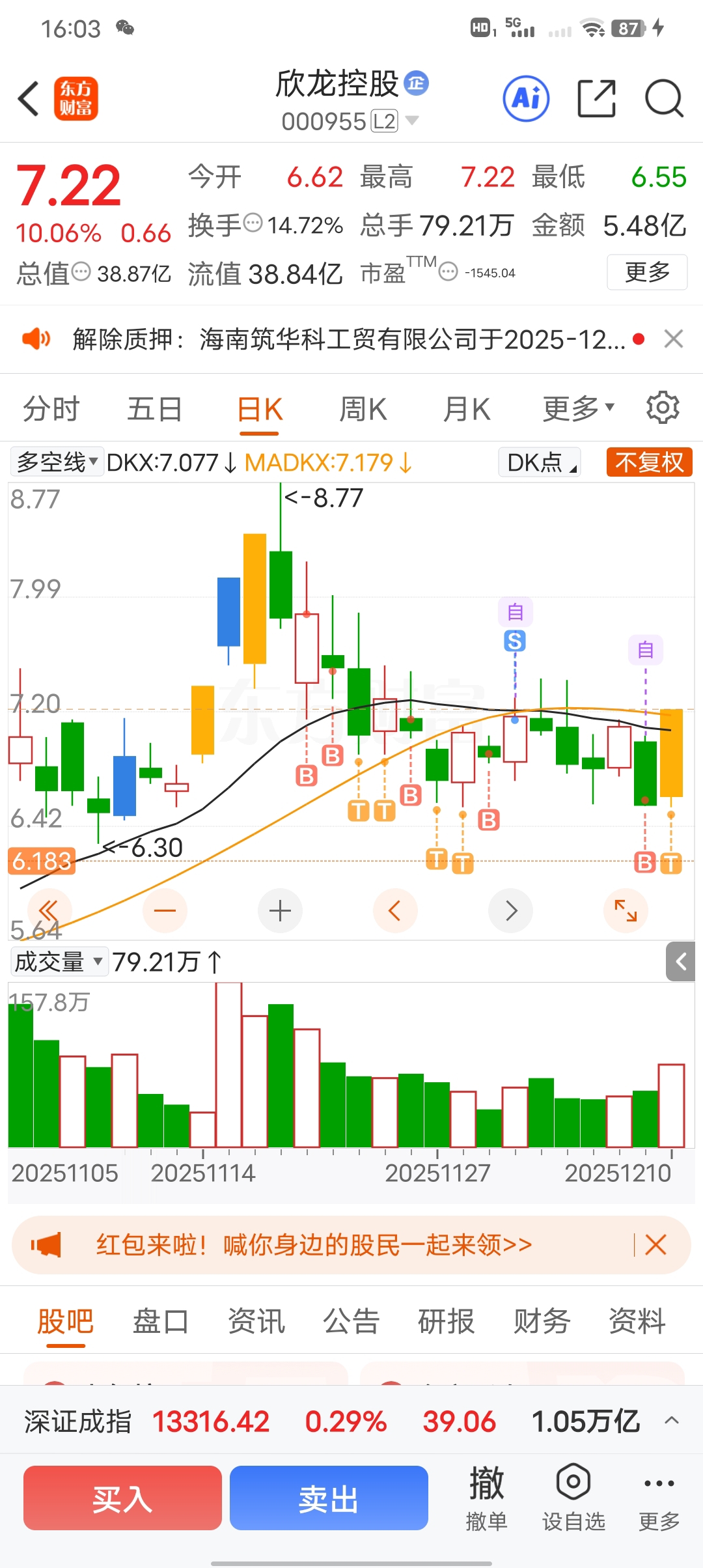 $欣龙控股(SZ000955)$ 轮到我发言了,今天又轮到海南了,而且欣龙今天其实是缩量的,为什么放量我说是缩量,扣掉对倒盘做t的资金,就是缩量,不懂怎么看对倒盘的点赞99个我来解答