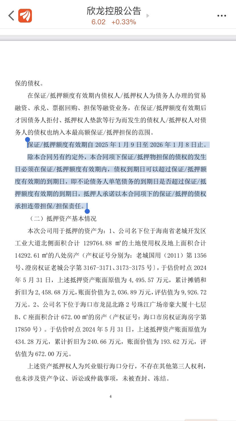 欣龙控股重大利空即将来临:保证/抵押额度有效期自2025年1月9日至2026年1