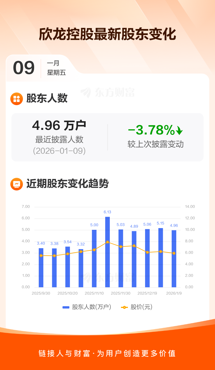欣龙控股:截至1月9日最新股东户数4.96万户,较上期减少3.78%