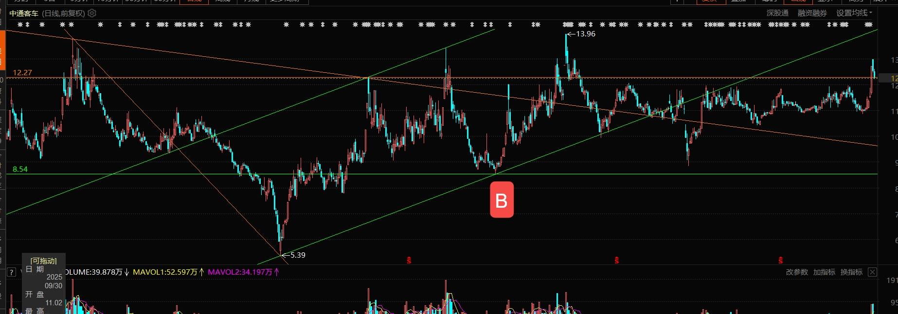 中通跌破上升趋势线,但是没有跌破B点平行线。趋势支撑变压力,大约在13.9附近。涨停突破12.27压力,稍微放量,需要调整,关注11.95附近支撑,不破可能进一步到13.5到13.9区间
