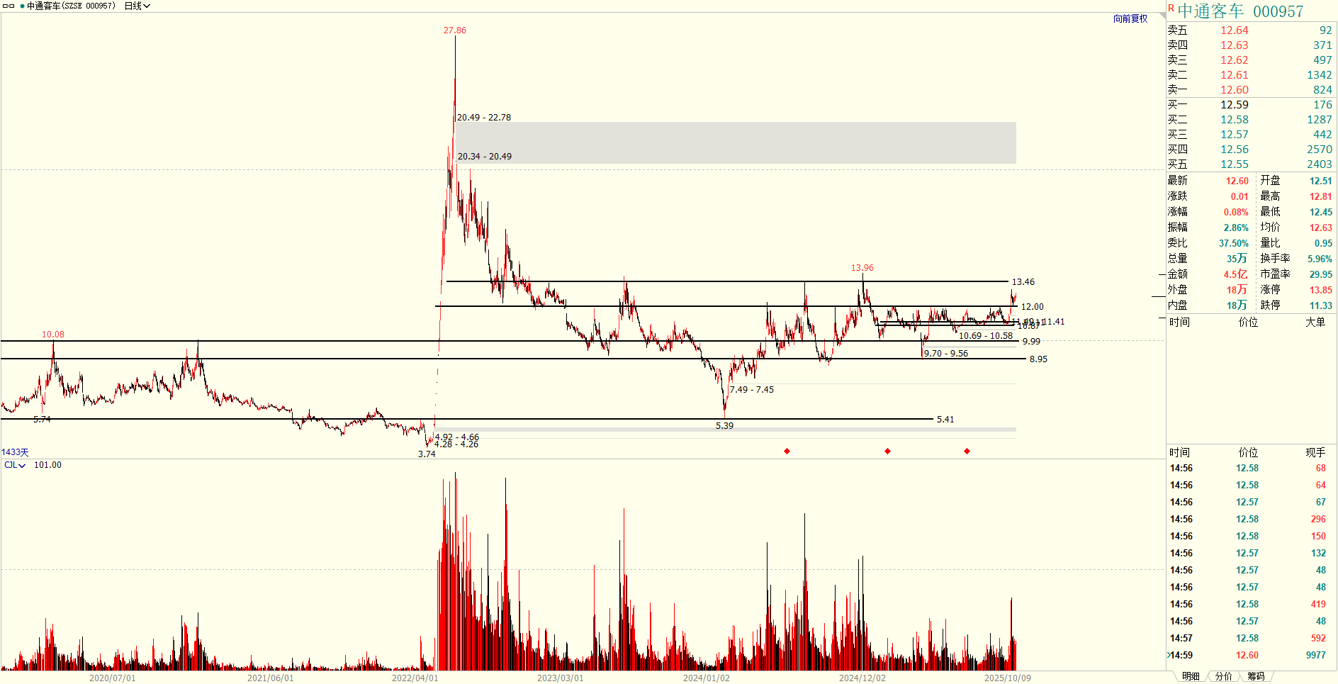 一把直尺打天下/中通客车9-13.5大规模头肩底,对应趋势目标27;行情在11-