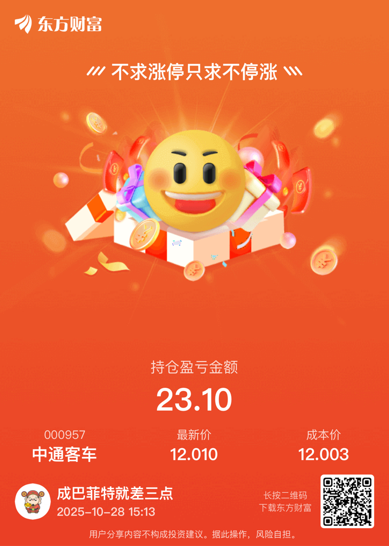 $中通客车(SZ000957)$ 无敌了,今天买的赚1分钱