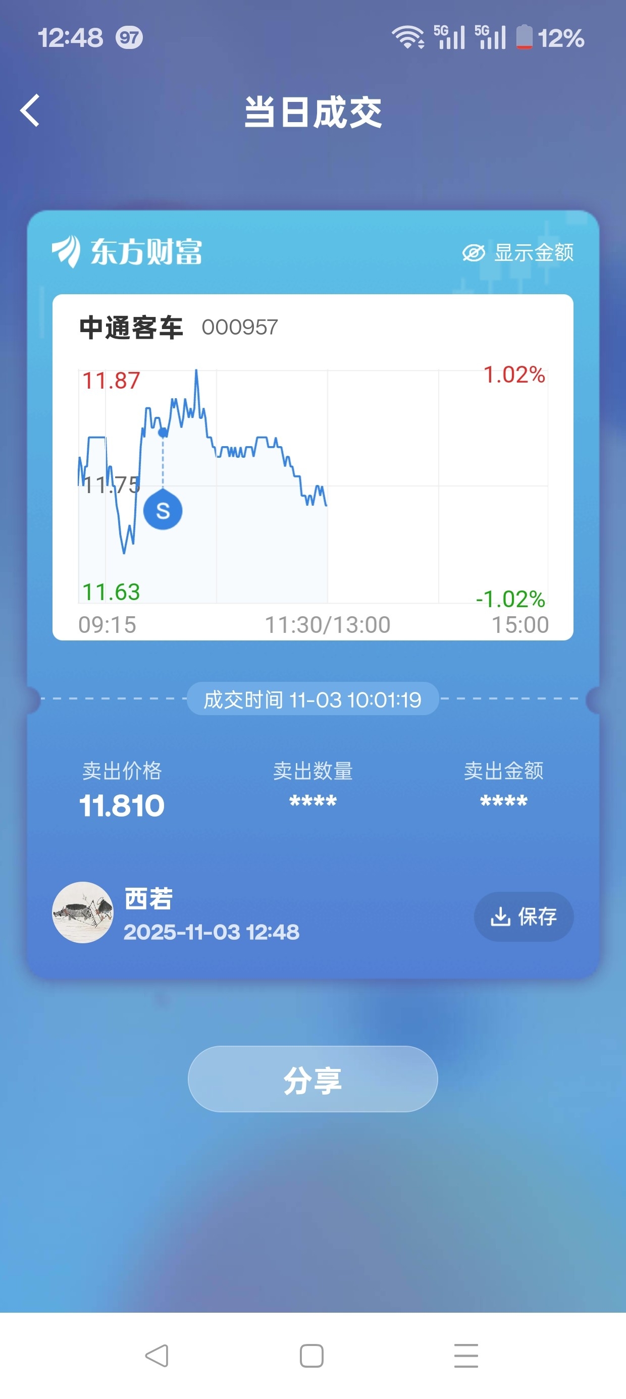 $中通客车(SZ000957)$ 昨天卖的不好,今天卖出就好了