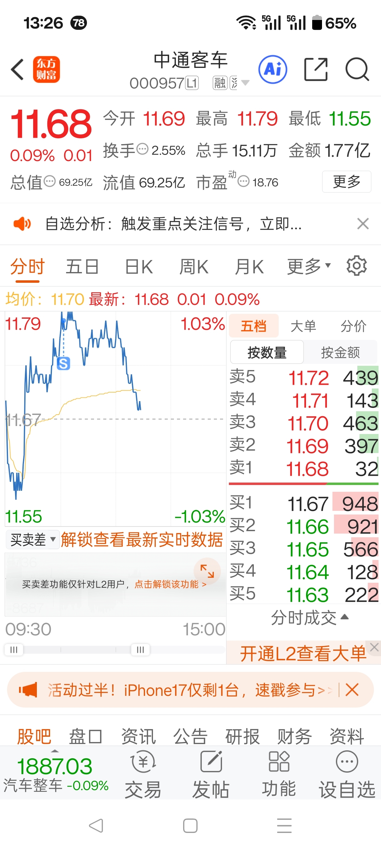 $中通客车(SZ000957)$ 机会来了。可以积极买入11.68做反弹。。看,买的机会来了