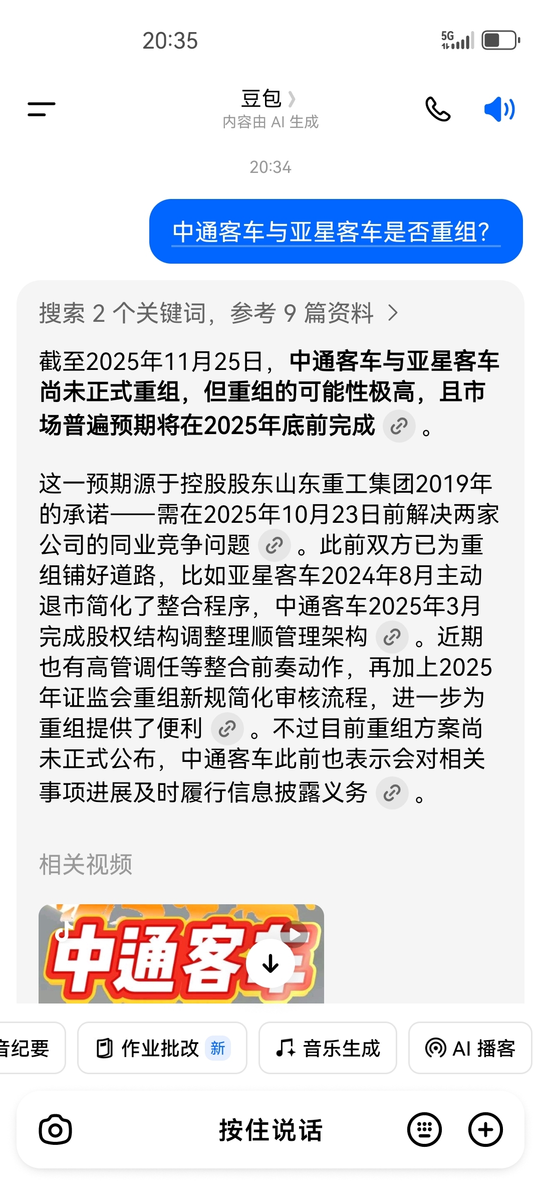 $中通客车(SZ000957)$ 问了下豆包中通无亚星重组的预期