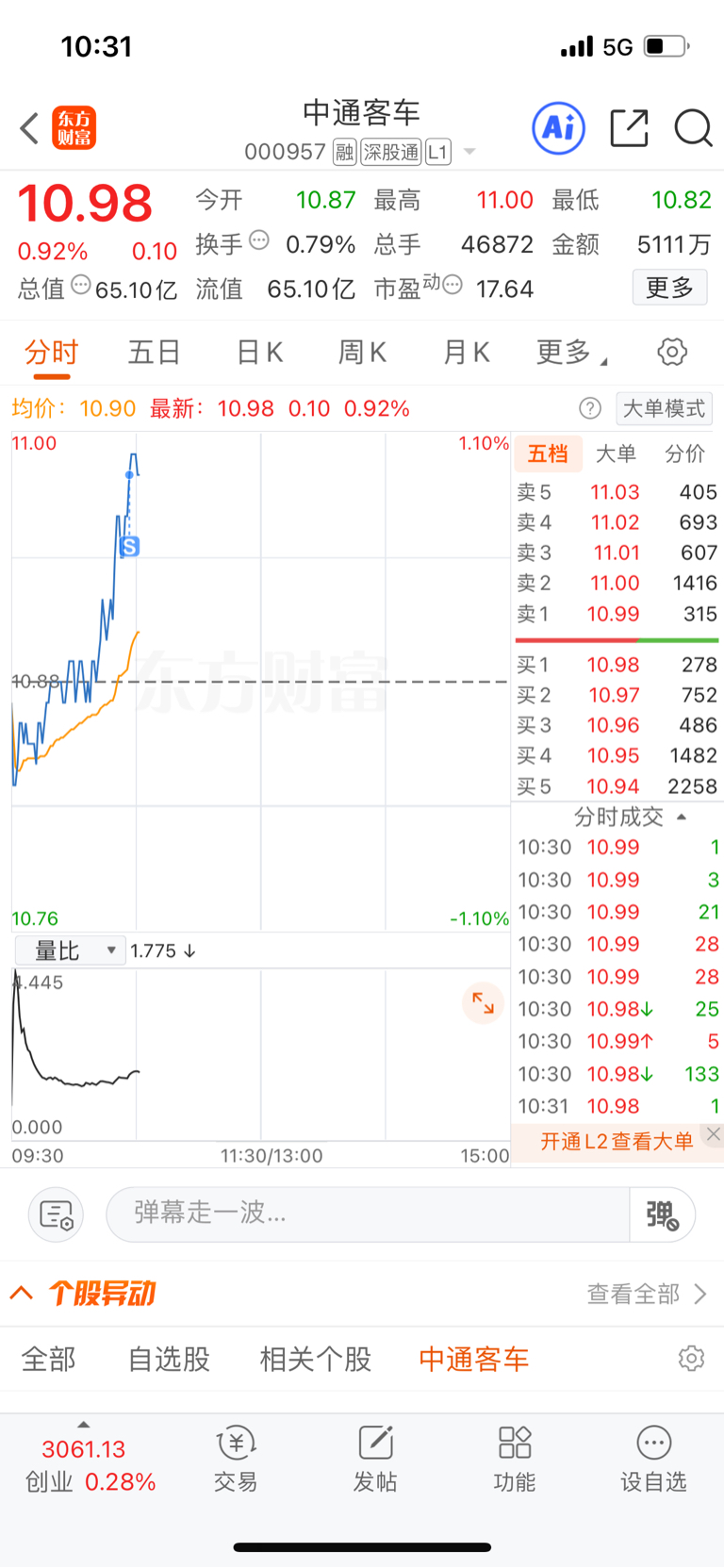 $中通客车(SZ000957)$ 先撤,下午接回,提升回本速度