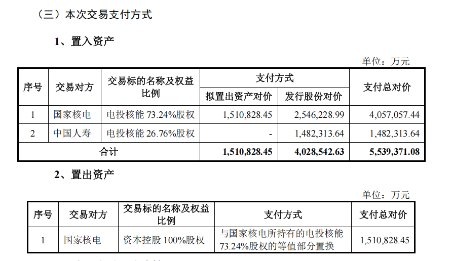置入资产电投核能100%股权作价553.94亿元,置出资产资本控股100%股权作价151.08亿元,二者差额达402.85亿元。该部分差额由电投产融向国家核电及中国人寿发行股份支付。