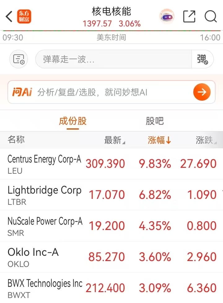 2026.01.28美股核电核能集体大涨,板块大涨3.06%。