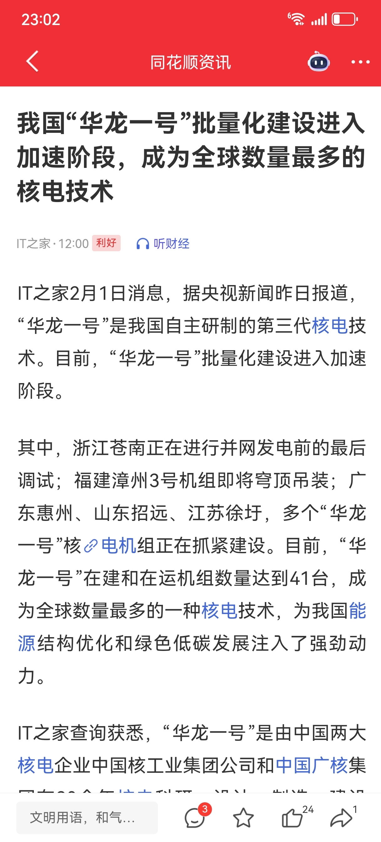 $电投产融(SZ000958)$ 国和一号示范机组都没全部商业化,接下来莱阳核电批准,也要2030年以后才能并网发电,那才是第三台。市场短期不会认可,十五五还是华龙一号为主导。国和一号批量化了,可控核聚变技术又上了一个台阶,市场冷落,是有原因的。
