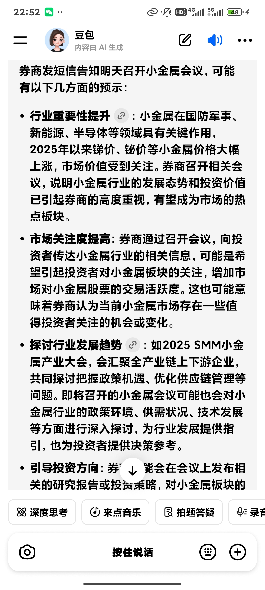 $锡业股份(SZ000960)$ - 引导投资方向:券商可能会在会议上发布相关的研究报告或投资策略,对小金属板块的投资机会进行分析和推荐 。这可能会引导投资者的资金流向小金属相关的股票或其他投资产品,对小金属市场的行情产生一定的影响。