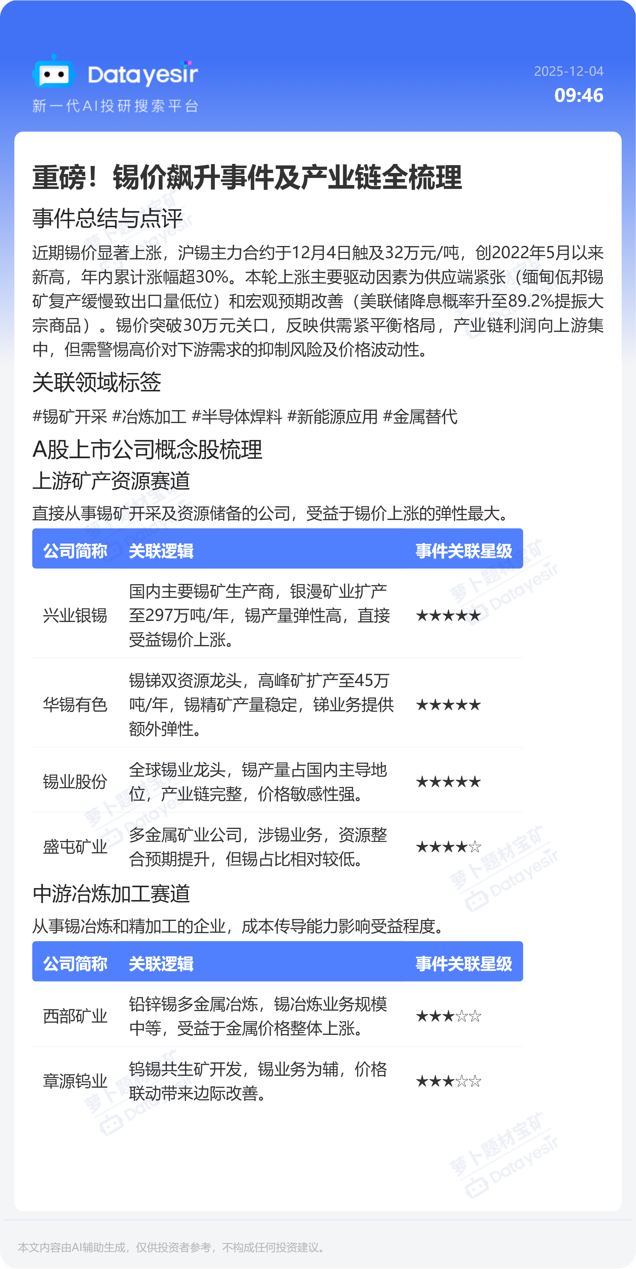 近期锡价显著上涨,沪锡主力合约于12月4日触及32万元/吨,创2022年5月以来新高,年内累计涨幅超30%。本轮上涨主要驱动因素为供应端紧张(缅甸佤邦锡矿复产缓慢致出口量低位)和宏观预期改善(美联储降息概率升至89.2%提振大宗商品)。