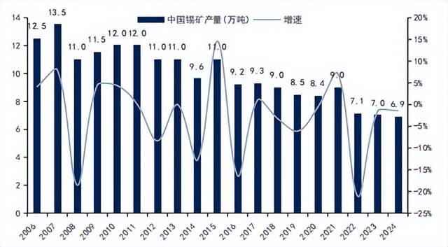 如果把时间线拉长,可以看出,我国锡矿产量呈下降趋势,从2007年高点13.5万吨降低至2024年的年产6.9万吨。此外,国内部分骨干锡矿山面临资源枯竭,导致国内锡资源储量逐步下降。