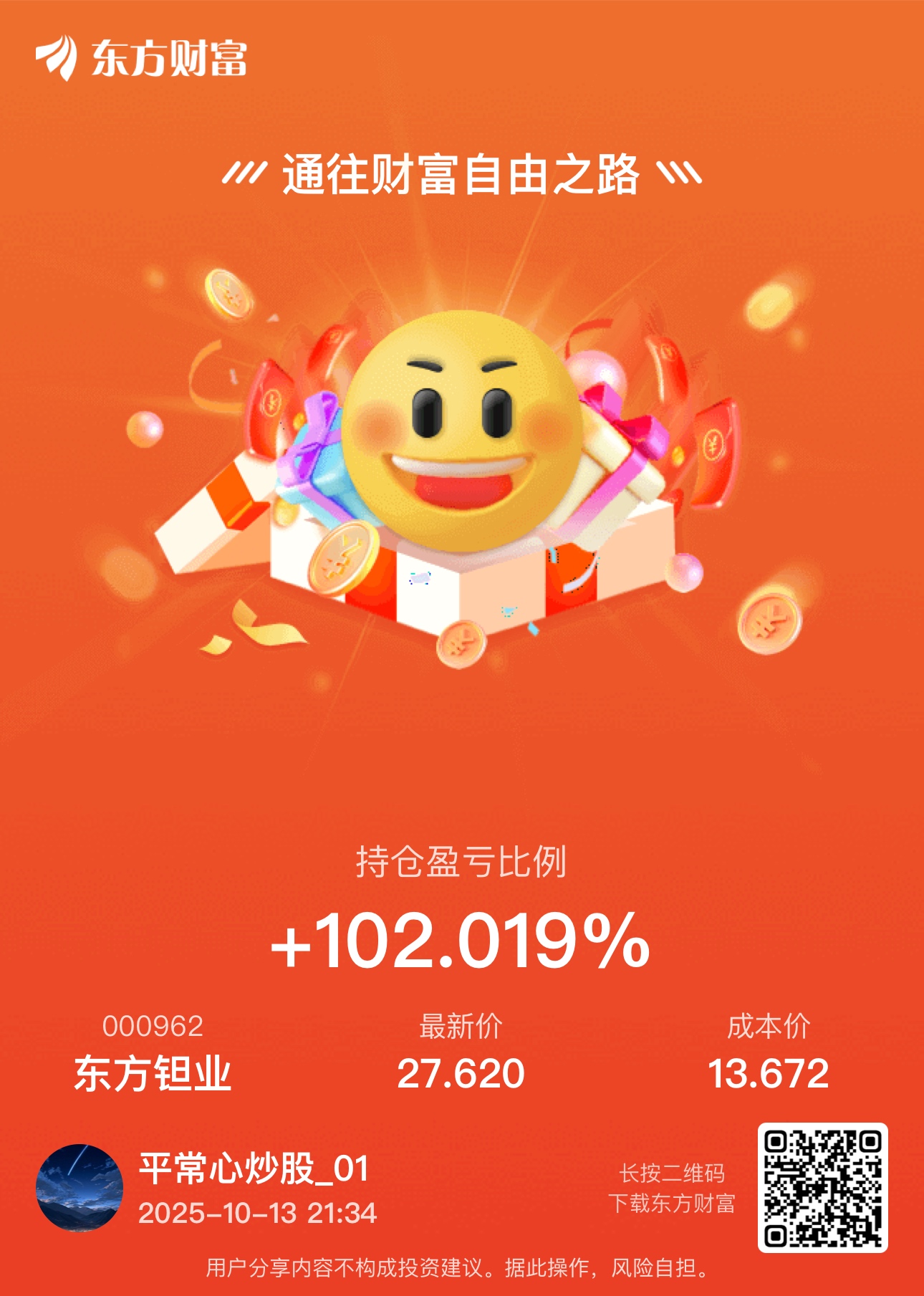 $东方钽业(SZ000962)$ 终于突破一百个点,这一路走来的艰辛只有自己才知道!