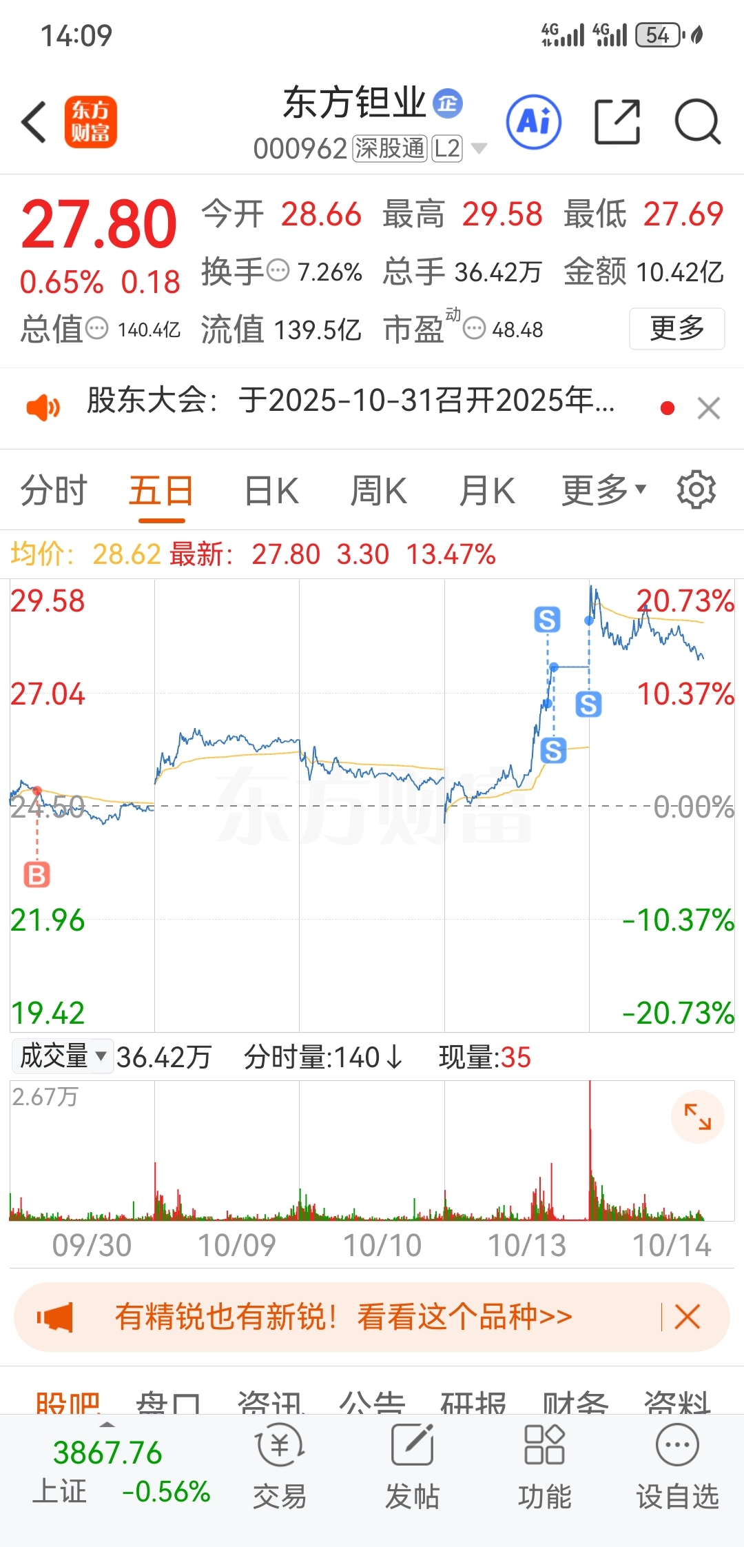 $东方钽业(SZ000962)$ 今日开盘全部清空。本周不站上28.57,回调很大。