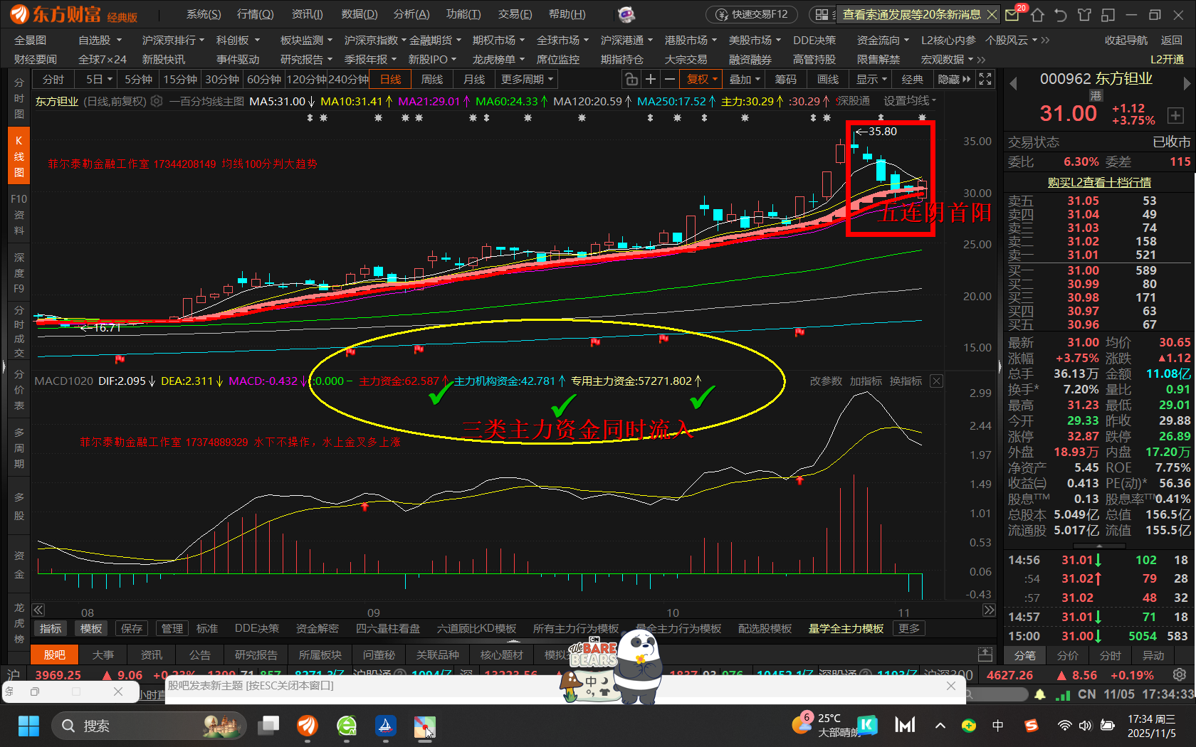 东方钽业股价五连阴首阳,而且三类不同的主力资金同时流入