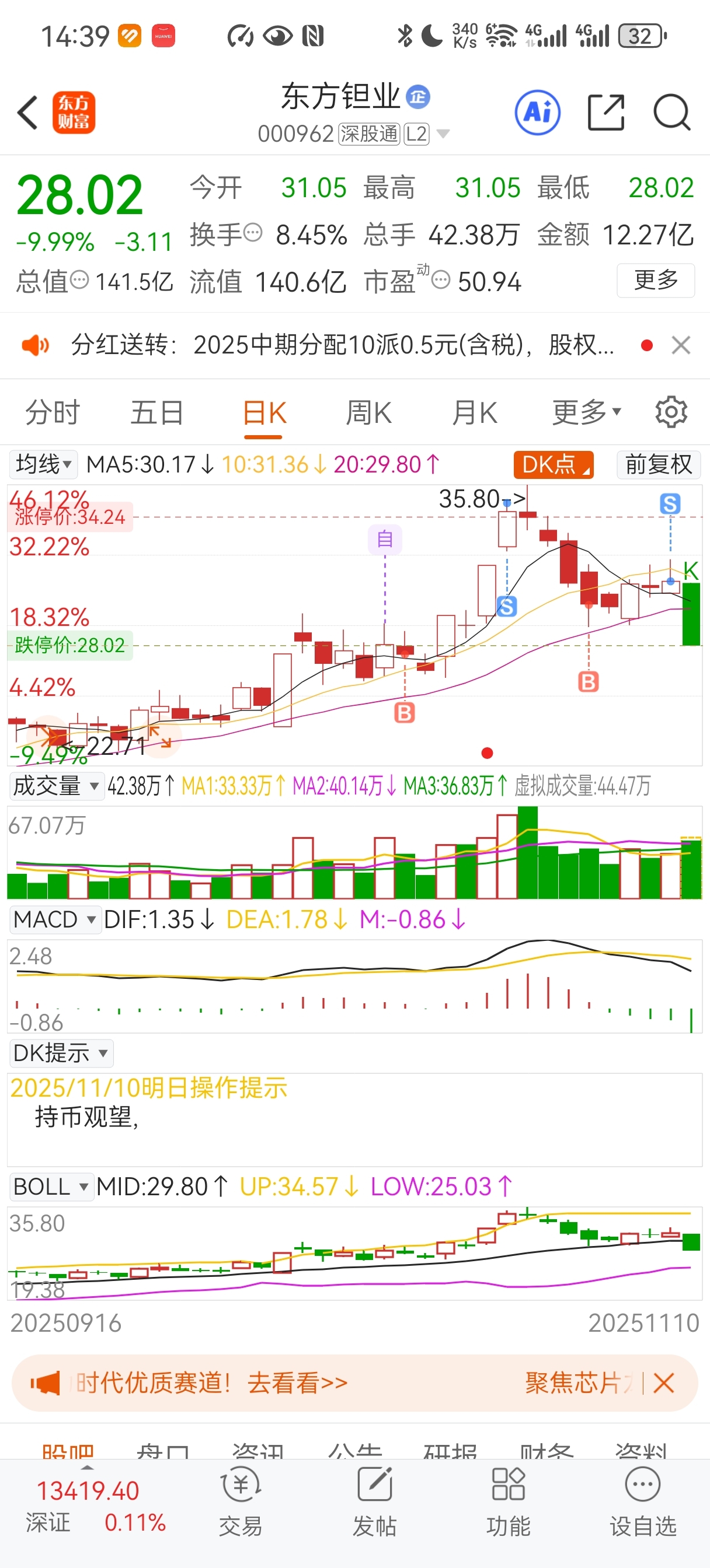 $东方钽业(SZ000962)$ 侥幸跑路了