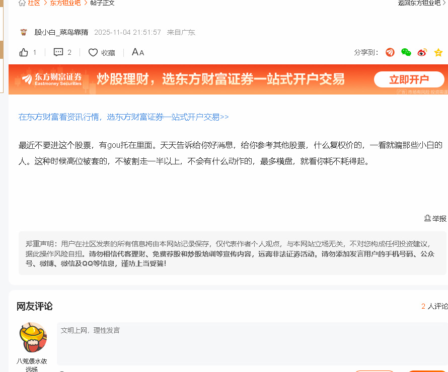温馨提示: 1.根据《证券法》规定,禁止编造、传播虚假信息或者误导性信息,扰乱证券市场;2.用户在本社区发表的所有资料、言论等仅代表个人观点,与本网站立场无关,不对您构成任何投资建议。用户应基于自己的独立判断,自行决定证券投资并承担相应风险。《东方财富社区管理规定》