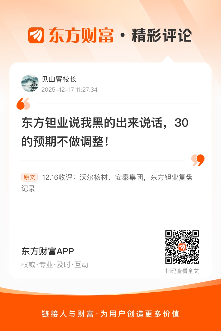 温馨提示: 1.根据《证券法》规定,禁止编造、传播虚假信息或者误导性信息,扰乱证券市场;2.用户在本社区发表的所有资料、言论等仅代表个人观点,与本网站立场无关,不对您构成任何投资建议。用户应基于自己的独立判断,自行决定证券投资并承担相应风险。《东方财富社区管理规定》