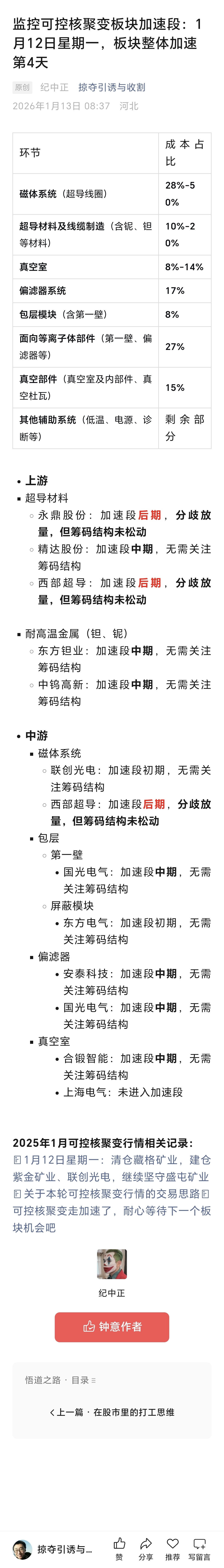 $东方钽业(SZ000962)$ $中钨高新(SZ000657)$ $联创光电(SH600363)$ 监控可控核聚变板块加速段:1月12日星期一,板块整体加速第4天