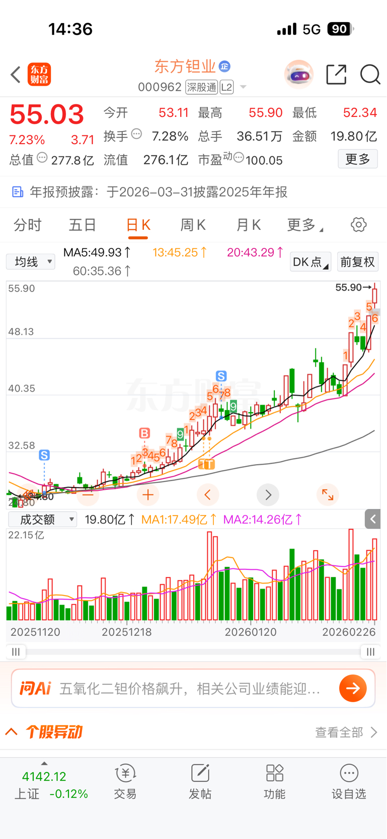$东方钽业(SZ000962)$ 没吃到大肉,好可惜