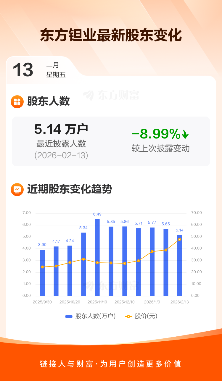 东方钽业:截至2月13日最新股东户数5.14万户,较上期减少8.99%