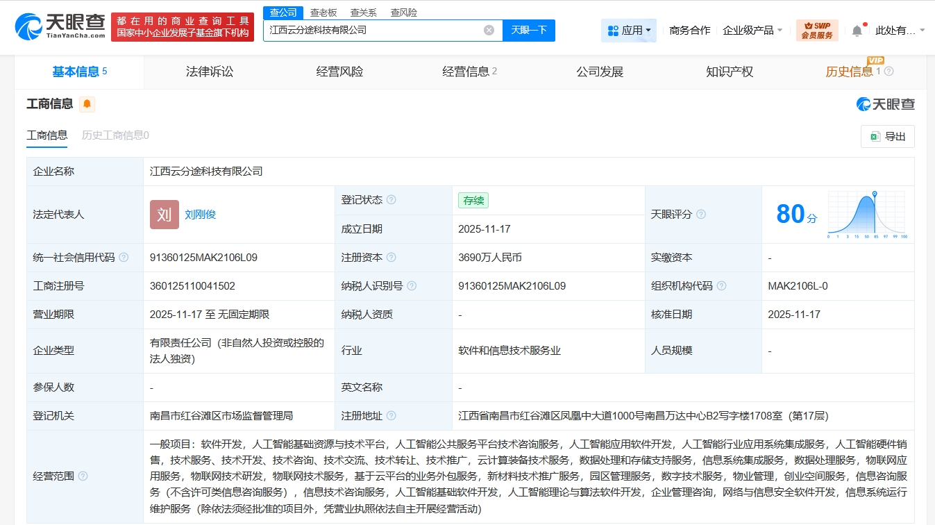 每经AI快讯,天眼查工商信息显示,近日,江西云分途科技有限公司成立,法定代表人为刘刚俊,注册资本3690万元人民币,经营范围含人工智能基础资源与技术平台、人工智能公共服务平台技术咨询服务、人工智能应用软件开发、人工智能行业应用系统集成服务、云计算装备技术服务、数据处理和存储支持服务、信息系统集成服务等。股东信息显示,该公司由华东医药(000963)全资持股。