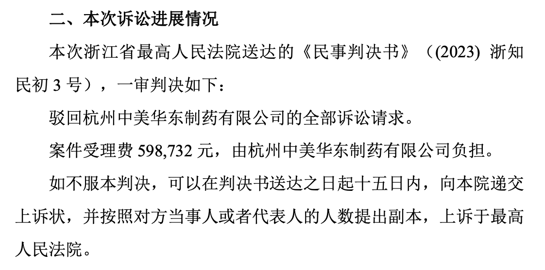 从最新进展看,浙江省高院的一审判决,驳回了中美华东的全部诉讼请求,并要求其负担59余万元的案件受理费。